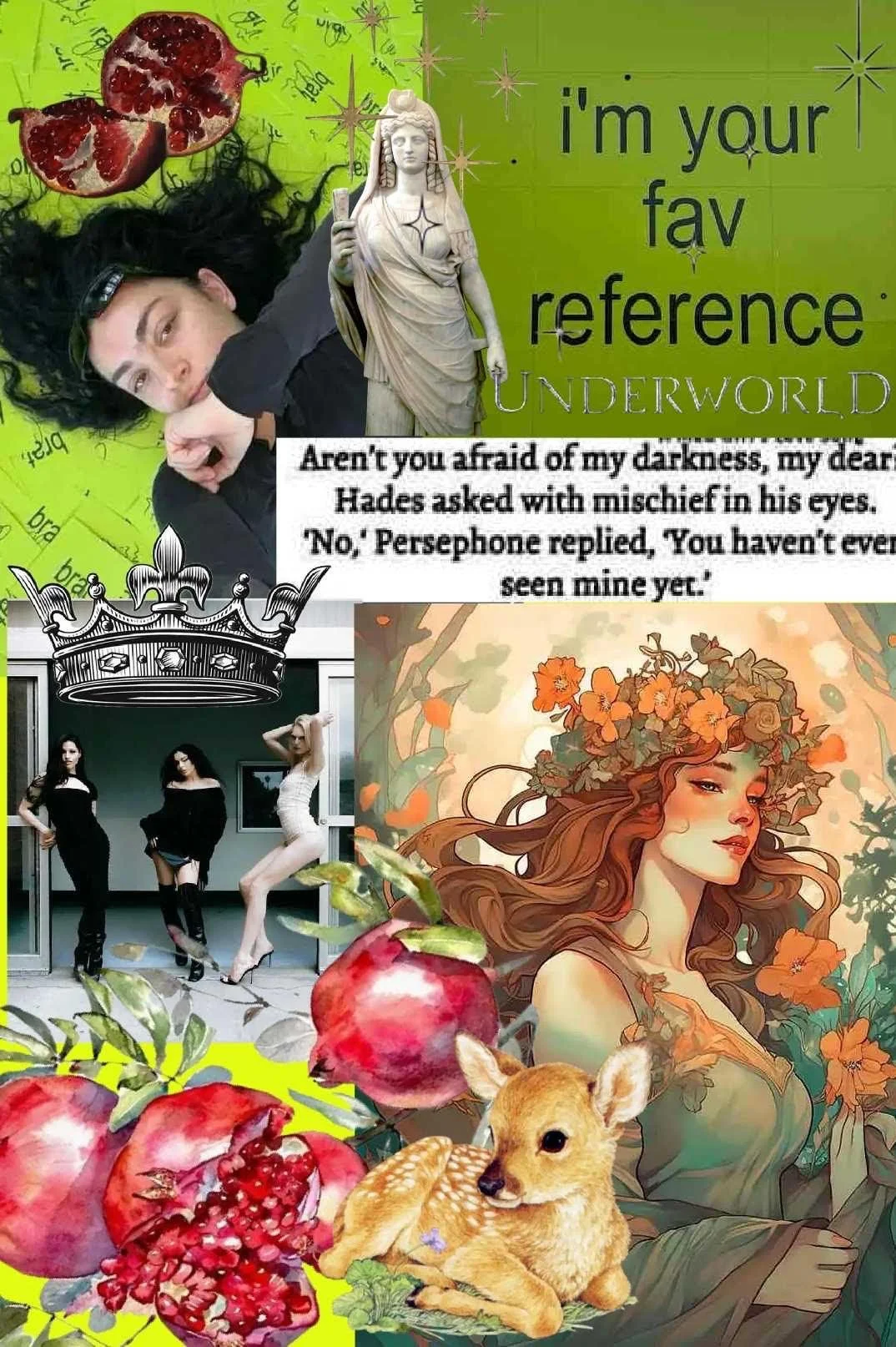 And all I’m trying to say is that Persephone is THAT girl. She’s not a victim of Hades. She’s the fucking Goddess of Spring and the Queen of the Underworld. Talk about a girl who can do it all. Truly, on the mood board, she’s the inspo for a Brat Summer <3 May we all have a pomegranate spritz on a patio in her honor. Oh, and do yourself a favor and read some SEXY retellings of her myth! Once I’m done with the A Touch of Darkness saga, I’m running straight to Neon Gods by Katee Robert.